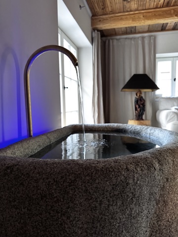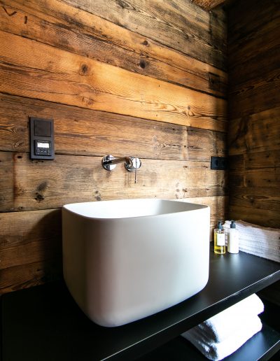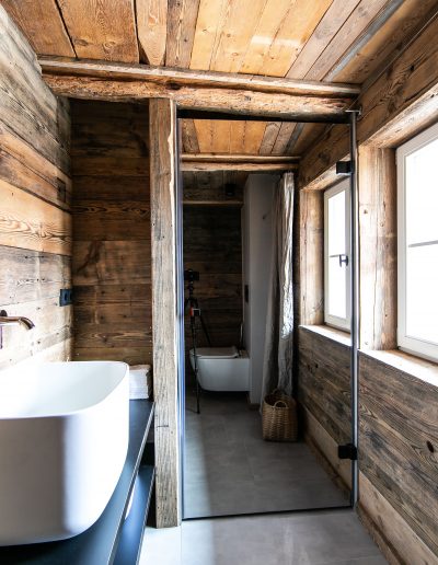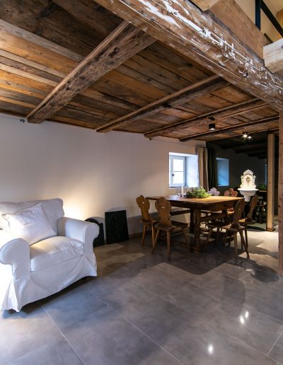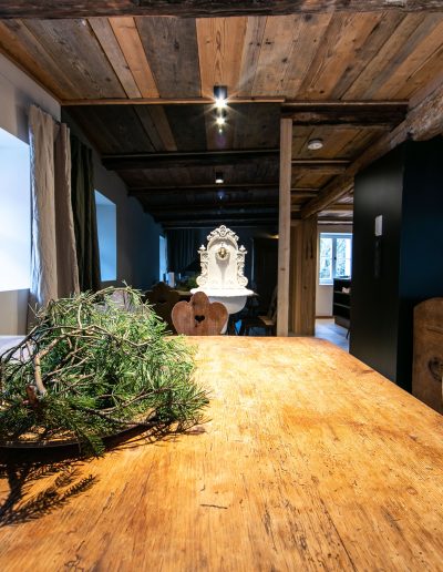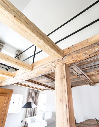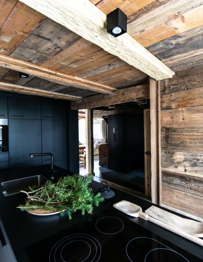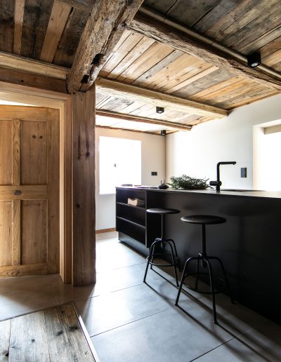 Gestalterisch wurde bewusst viel Altholz eingesetzt, um die eigene Ausstrahlung des Hauses zu erhalten. Schwarze Glasflächen sorgen für moderne Akzente und schaffen durch ihre spiegelnde Wirkung optische Raumvergrößerungen – besonders bei den niedrigen Decken ein wirkungsvolles Mittel.