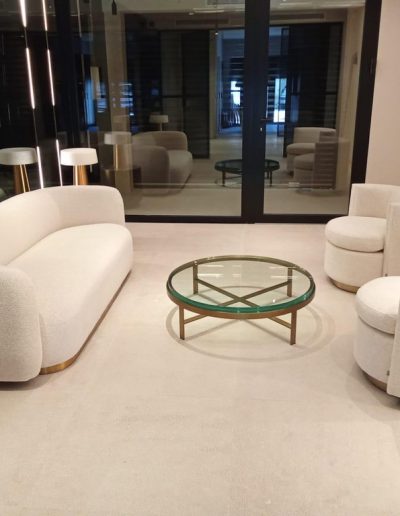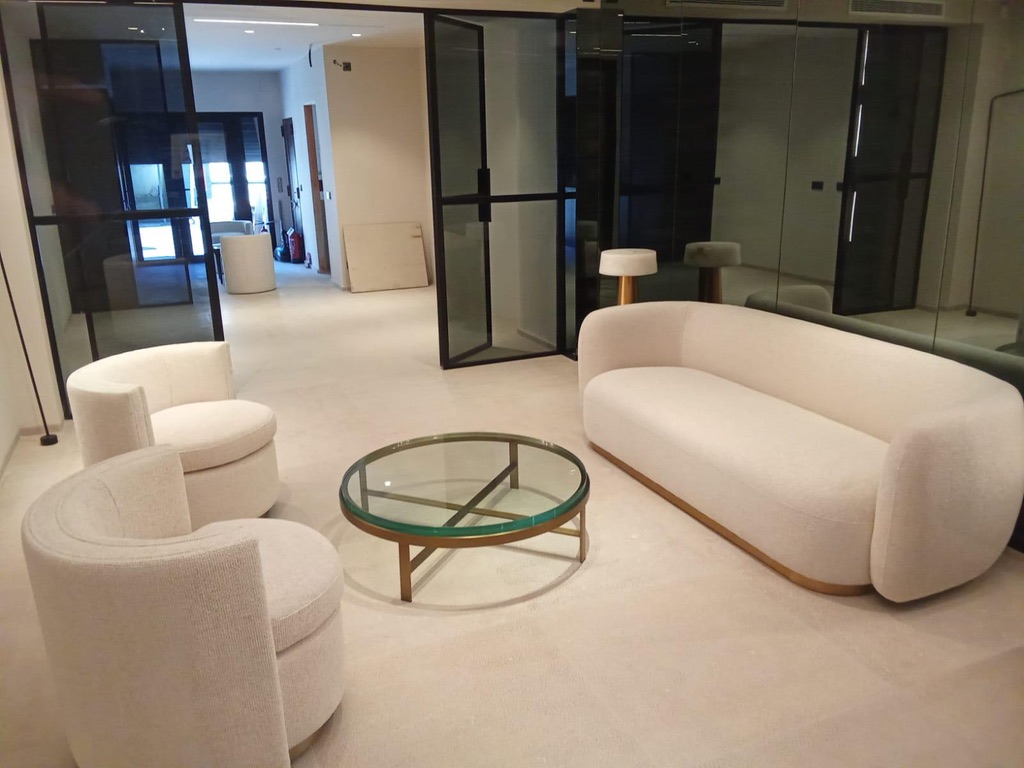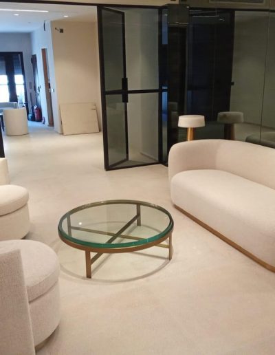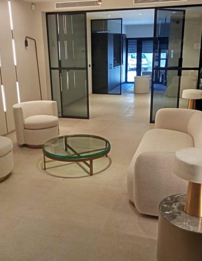 Als Bodenbelag entschieden wir uns für den mallorquinischen Naturstein Beige Levante, der mit seiner warmen, strukturierten Oberfläche ein wunderbar anheimelndes Ambiente schafft. Auch hier setzten wir bewusst verspiegelte Wandflächen als Gestaltungselement ein, was den Raum deutlich größer wirken lässt. Die hochwertige Möblierung entstand in Zusammenarbeit mit dem Unternehmen Private Hideaway Interior auf Mallorca.