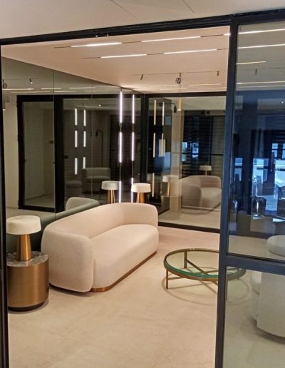 Ein besonderes Highlight dieses Projekts bildet das Lichtkonzept. Hier arbeiteten wir mit flächenbündig integrierten Lichtschienen, die dem Raum eine grafische Ausstrahlung verleihen.