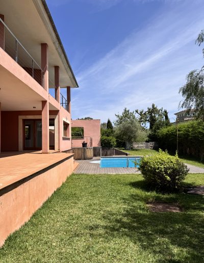 Die Fassade erhält ein neues Erscheinungsbild: Ein erdiges Umbra-Rot verwandelt sich in ein strahlendes Lichtrot, das dem Gebäude neue Frische verleiht. Der Garten wird neu komponiert – im Dialog mit den vorhandenen schönen Altbäumen entsteht eine Gestaltung, die dem Pool mehr Präsenz verleiht und dem Ensemble die bislang fehlende Üppigkeit und Raffinesse schenkt.